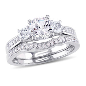 6.0mm White Sapphire and 1/8 CT. T.W. Diamond Three Stone Bridal Set in 10K White Gold