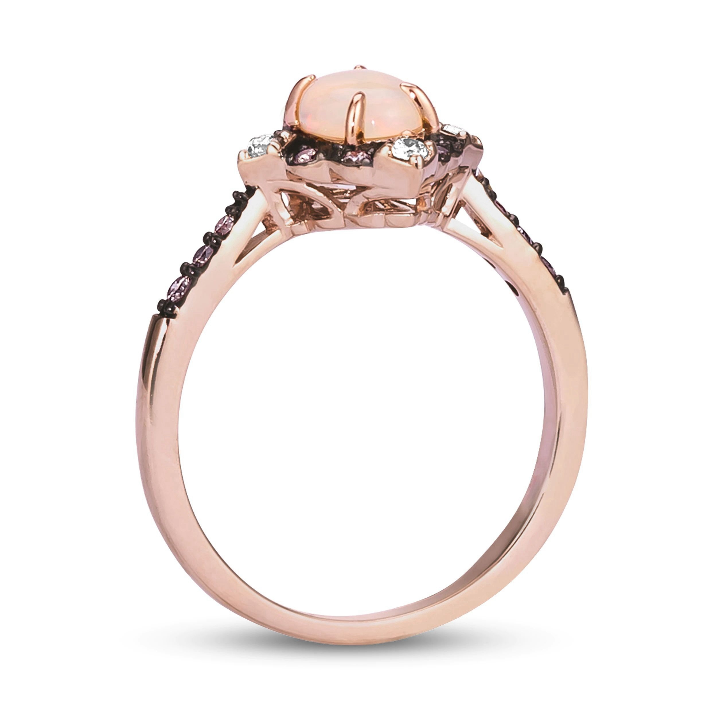 Please note: This ring is available in limited sizes. If you don’t see your size here, please visit a store to order your ring. This dreamy ring from showcases a beautiful oval Opal at its center, surrounded by a tempting frame of Chocolate Diamonds and Nude Diamonds. More rich Chocolate Diamonds frost the sides of the band for a total diamond weight of 1/5 carat. The ring is set in sweet 14K Strawberry Gold.